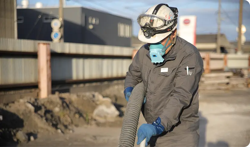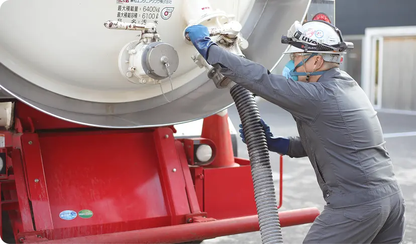 私は「パワープロベスター」と呼ばれる大型の特殊吸引車を使い、苅田町を拠点に北九州・山口・大分などの工場で吸引清掃作業を行っています。当社では、乾いた粉状の物質を吸い取ることができる、珍しいタイプの吸引車を導入しています。さらに、汚泥などの水分を含んだものにも対応できる車両も保有しているため、さまざまな現場の清掃作業に柔軟に対応できます。そのため、関西など遠方の企業からも多くのご依頼をいただいています。出張作業に出る機会も多く、地域を越えて活躍できるチャンスがあるのもこの仕事の魅力です。目立つ仕事ではありませんが、工場の安定稼働を支える“現場の守り手”として、責任と誇りを持って日々の業務に取り組んでいます。
